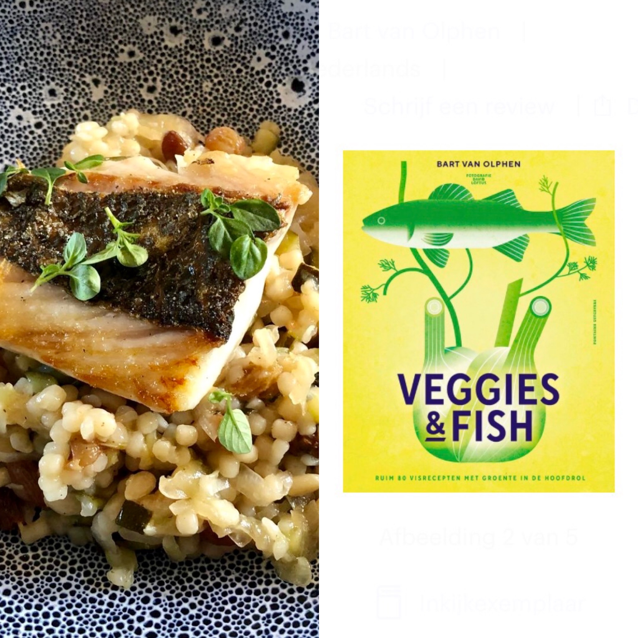 3 dagen geleden dit boek van Bart van Olphen cadeau gekregen en ik was meteen verkocht. Werkelijk ieder recept zou ik zo willen maken! Vandaag gekozen voor deze met dorade, uien (veel), courgette, rozijnen, pijnboompitten en parelcouscous. Het maakte de verwachtingen meer dan waar. Niet moeilijk om te maken alhoewel ik het best eng vond met die hoeveelheid azijn, maar de zoetzuur balans was ronduit goed. Ik moet wel zeggen dat ik voor zoete uien had gekozen en deze in dunne ringen had gesneden op de mandoline. Door ze dan zachtjes te stoven karamelliseren ze ook nog enigszins. In plaats van gewone tijm heb ik wat citroentijm uit de tuin geplukt en ipv zout heb ik wat bouillon gebruikt. Daarmee was het geheel perfect op smaak. Op het plaatje zie je het niet, maar het gerecht bevat dus veel groente en het snijden daarvan is het meeste werk. Wij aten het als onderdeel van een menu en dat was een goede keuze, want door al die groente en het zure is het niet zwaar. We aten ook met 4-en van dit voor 2 personen bedoelde gerecht (wel hele courgette gebruikt en iets meer parelcouscous). Het enthousiasme van het bezoek was even groot als mijn plezier om het te maken. Ik ga vast snel weer iets maken met Veggies & Fish ?