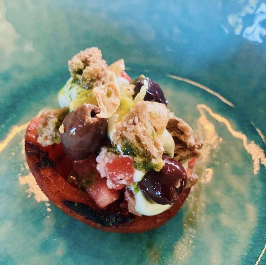 Het gerecht is een tomaat die je vult met een salade van tomaat, sjalot, dragon, Parmezaan, Taggiasche olijven en op smaak gebracht met olie en Cabernet Sauvignonazijn. Met daarop een ricotta lichtgroen gekleurd door spciy dragonolie erdoor te mengen. Je garneert het met olijven, zuurdesemcroutons, krokante knoflook en citroenrasp.
