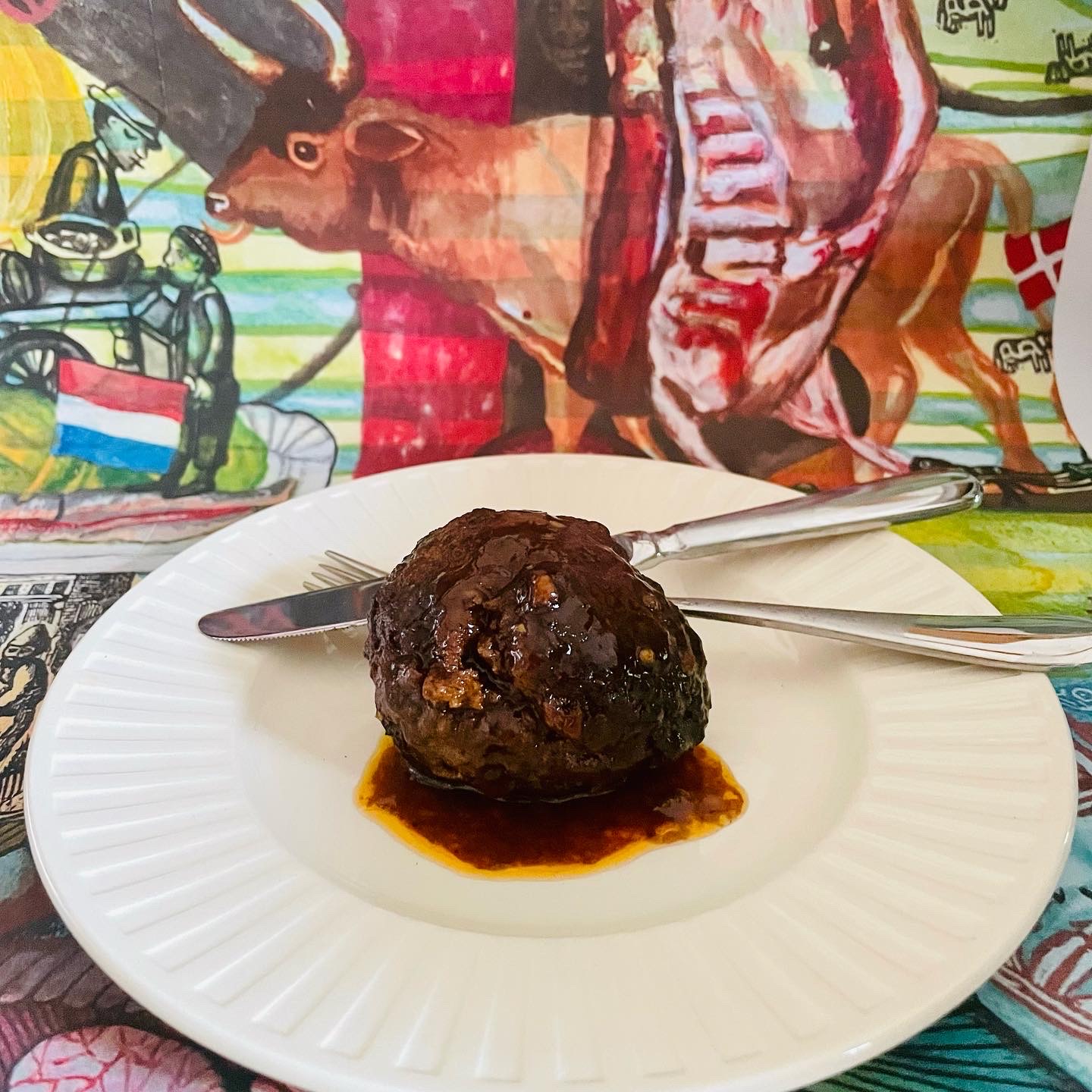 Gehaktballen van rundergehakt. En kijk eens naar de geweldige achtergrond… tafelkleed van @tomheerschop.
