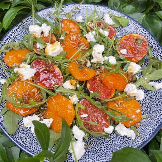 Vijgen en sinaasappel op rucola scheppen, dressing erover verdelen en feta erover verkruimelen. Garneren met oregano.
