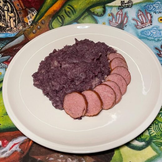 Stamppot van pastinaak, rode kool, appel en rookworst