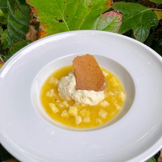Het friszure van de ananas met het zoete van de mousse is ronduit lekker! Wel zou ik de soep meer als saus serveren en dus aanzienlijk minder. Dan vind ik persoonlijk de verhouding beter. Daarnaast wordt het kletskopje geen kletskop, maar een koekje…. De smaak is prima, maar… ik zou echt losse koekjes bakken en niet één grote waar je de stukken vanaf breekt. Bij mij werden de randen bijna zwart en was het middenstuk nog bleek… maar ook hier was de smaak prima.