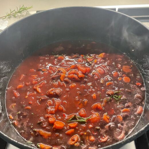 Het recept dat ik op internet vond deed me erg aan de Italiaanse ossobucco denken, maar een Spaans pepertje erbij en een flinke scheut mooie Ruby Port gaf het gerecht precies de intensiteit die het gerecht en deze wijn van een bijzonder wijnmaker verdiende.