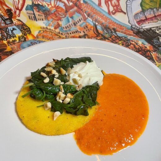 Het gerecht bestaat uit 3 componenten: maïskoekjes, paprikasaus en spinazie.