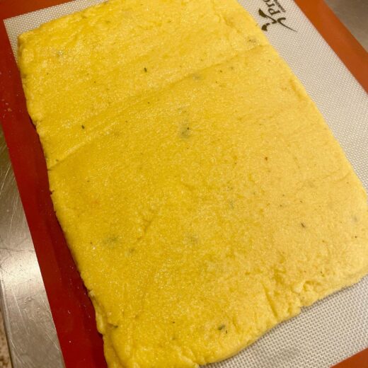 De spinazie roerbak je met een sjalotje. De paprikasaus maak je van gegrilde paprika, ui, slagroom en bouillon. De maïskoekjes van grove maïsgries (=polenta) die je kookt in bouillon met tijm en knoflook. Ik had overigens fijne polenta en dat ging ook uitstekend. Daarna voeg je kaas en boter toe en stort hem uit in een platte bak. Ik deed het op een bakmat (zie laatste foto). Af laten koelen, koekjes van snijden/steken en die om en om bakken.